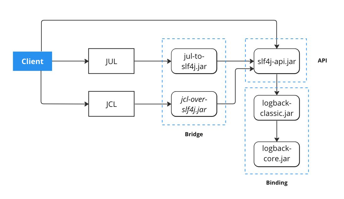 - JUL, JCL은 브릿지를 통해 SLF4J API로 연결합니다.