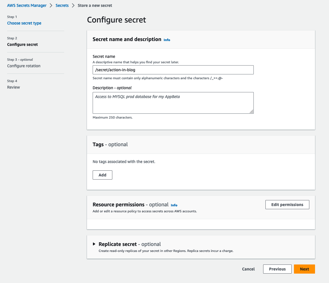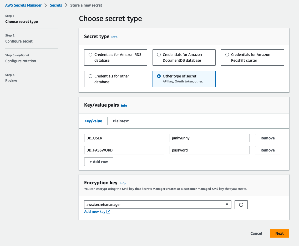 AWS Secrets Manager에 간단한 프로퍼티를 설정하고 애플리케이션에서 주입 받는 예제를 살펴보자. 먼저 AWS 콘솔의 Secrets Manager에서 다음과 같은 과정을 통해 설정들을 추가한다.
