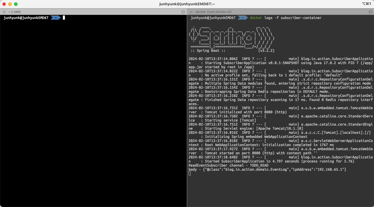 - 또 다른 터미널에선 구독자 서비스 컨테이너의 로그를 확인한다.