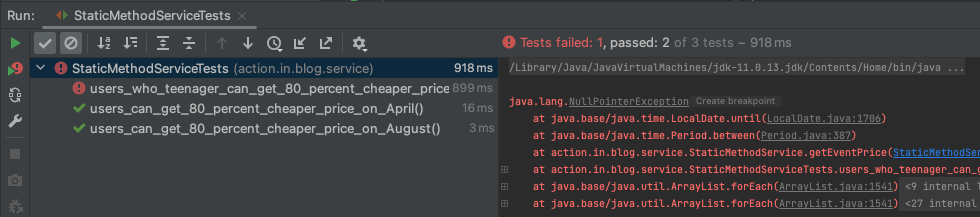 LocalDate클래스until메서드에서 에러가 발생합니다.LocalDate클래스from정적 메서드가 스터빙되지 않아null을 반환합니다.- 다음 라인에서