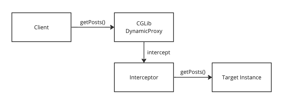 프록시 객체에서 getPosts 메소드의 실행을 가로채는 PostInterceptor 클래스를 살펴보자. MethodInterceptor 인터페이스를 구현하여 intercept 메서드를 정의한다.