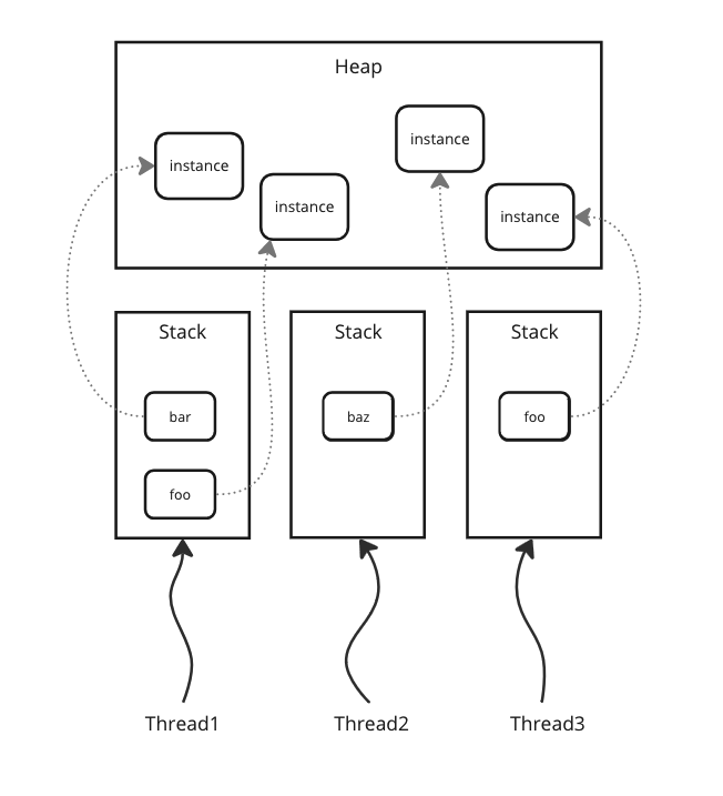 - 힙에 생성된 객체는 스택의 로컬 변수를 통해서만 접근 가능하기 때문에 다른 스레드에서 접근할 수 없습니다.