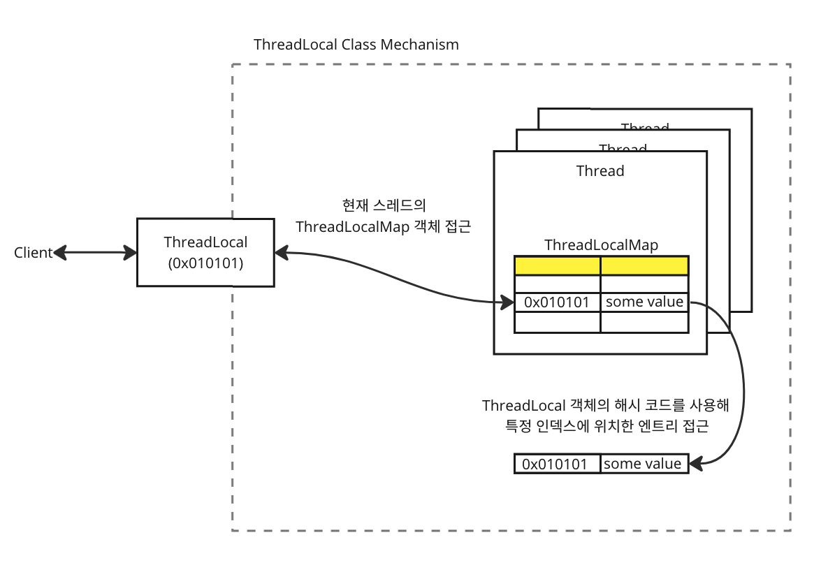 - 클라이언트(client)는 다음과 같은 내부 메커니즘(mechanism)을 통해 ThreadLocal 객체로부터 값을 꺼내거나 저장할 수 있습니다.