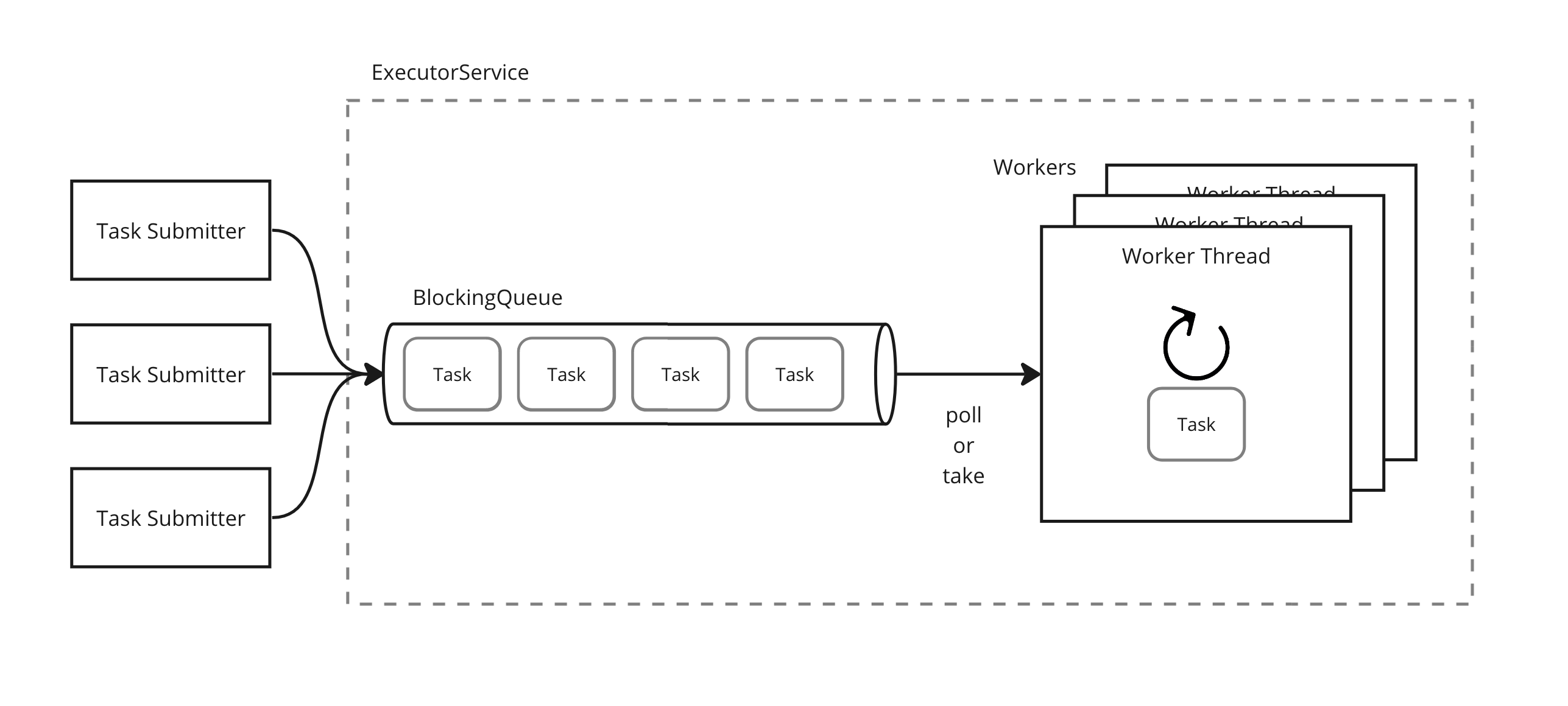 - 타임아웃이 없으므로 내부에서 take 메서드를 통해 작업을 얻습니다.