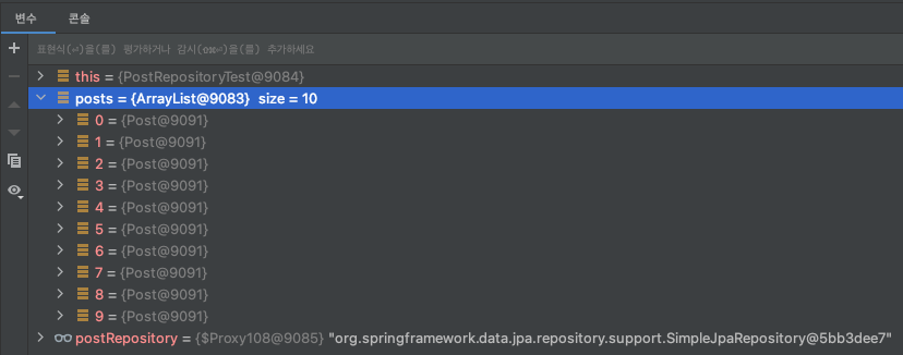 - Post 테이블과 Reply 테이블이 조인하면서 동일한 Post 엔티티 객체가 리스트에 10개 저장된다.