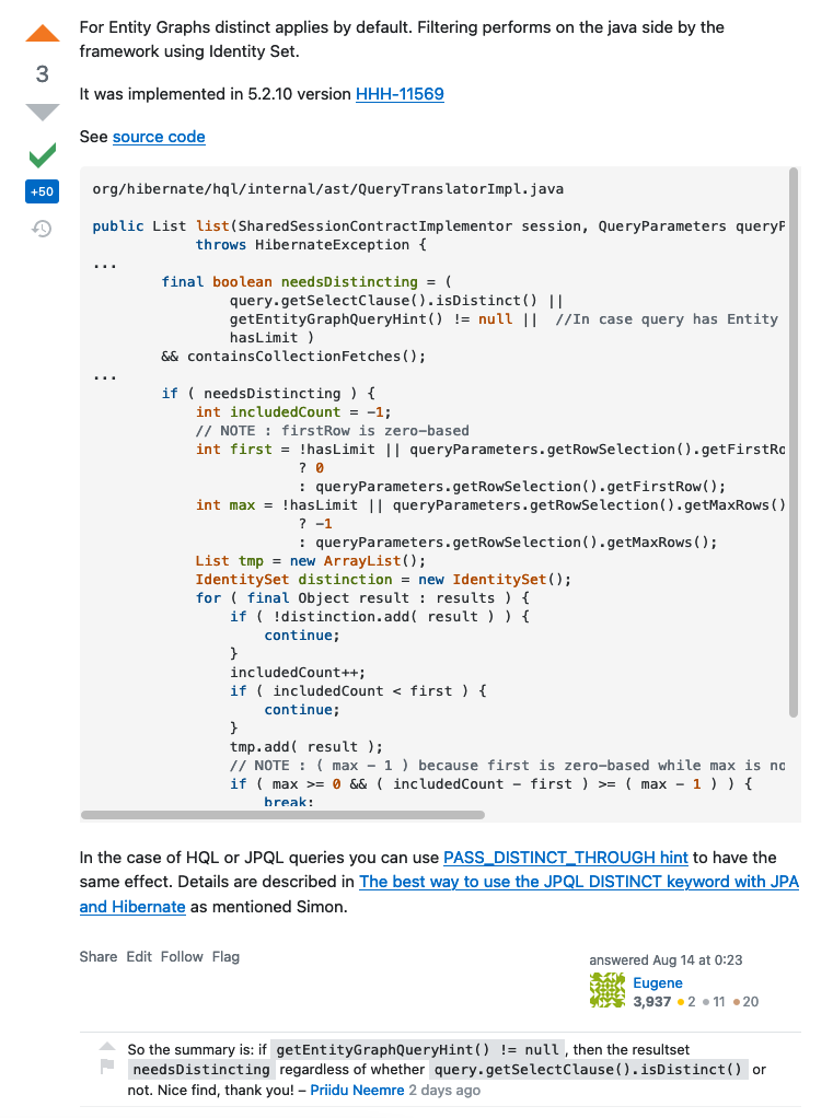 @EntityGraph 사용 시 중복 객체들이 제거되는 현상의 원인이 궁금하여 스택 오버플로우에 질문을 올리고 약 7개월만에 답변을 얻었다. 영원히 묻힐뻔한 질문이었지만, 나와 동일한 의문을 가진 사용자가 대신 바운티(bounty)를 걸어줬다. 바운티가 걸리니 2일만에 답변이 달렸다.