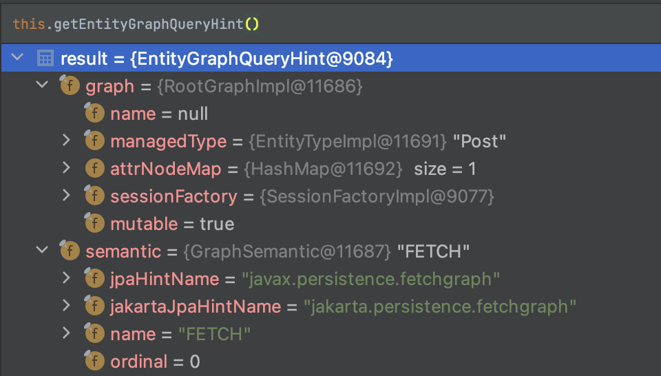 해당 코드 위치를 디버깅 모드로 살펴봤다. 아래 그림은 getEntityGraphQueryHint 메서드 수행 결과다.