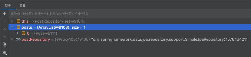 LEFT OUTER JOIN을 수행하였고, 별도의 중복 처리를 하지 않았음에도 Post 엔티티 객체가 리스트에 1개 저장된다.