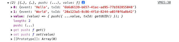 push메서드에 전달하는 객체는event밖에 없지만, 실제 저장된 데이터는txId값을 가지고 있습니다.txId값은 새로 정의한push메서드에 의해 자동으로 삽입됩니다.