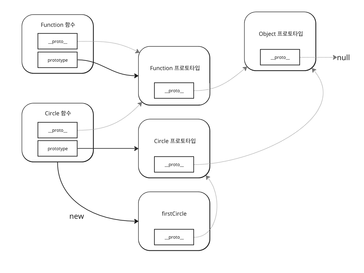 - firstCircle 인스턴스의 프로토타입 체인은 Circle 프로토타입과 Object 프로토타입 객체로 연결된다.