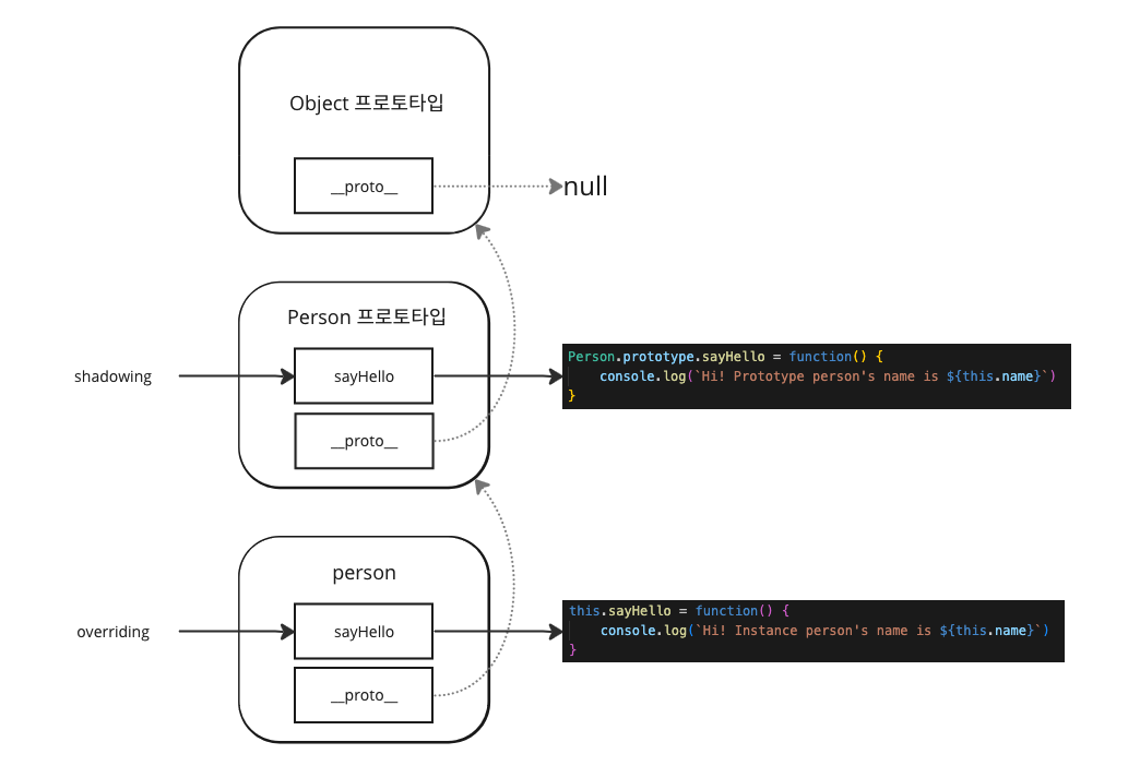 - 상위 프로토타입 객체에 위치한 프로퍼티를 하위 인스턴스가 재정의한 것을 의미한다.