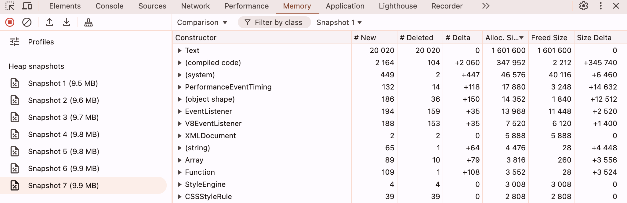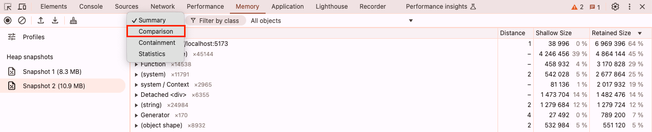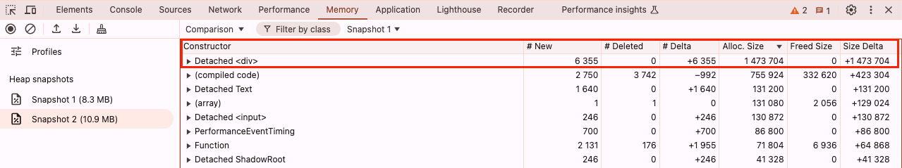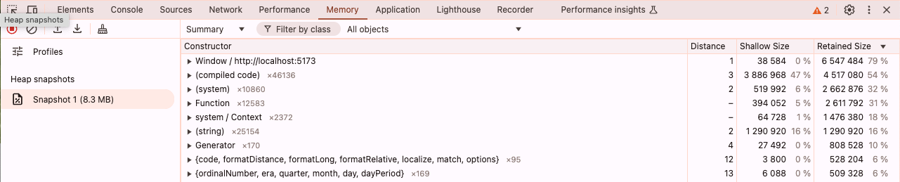 사용자가 애플리케이션에서 특정 행위를 반복하니 점점 애플리케이션이 느려진다는 리포트를 받았다. 메모리 누수를 의심했고, 어느 부분에서 메모리 누수가 발생하는지 찾기 위해 크롬 메모리 탭을 확인했다. 문제가 되는 인터랙션(interaction)을 수행하기 전 힙 메모리 스냅샷(snapshot)과 수행 후 인터랙션의 스냅샷을 비교해보면 2.6MB 바이트 정도의 차이가 난다.