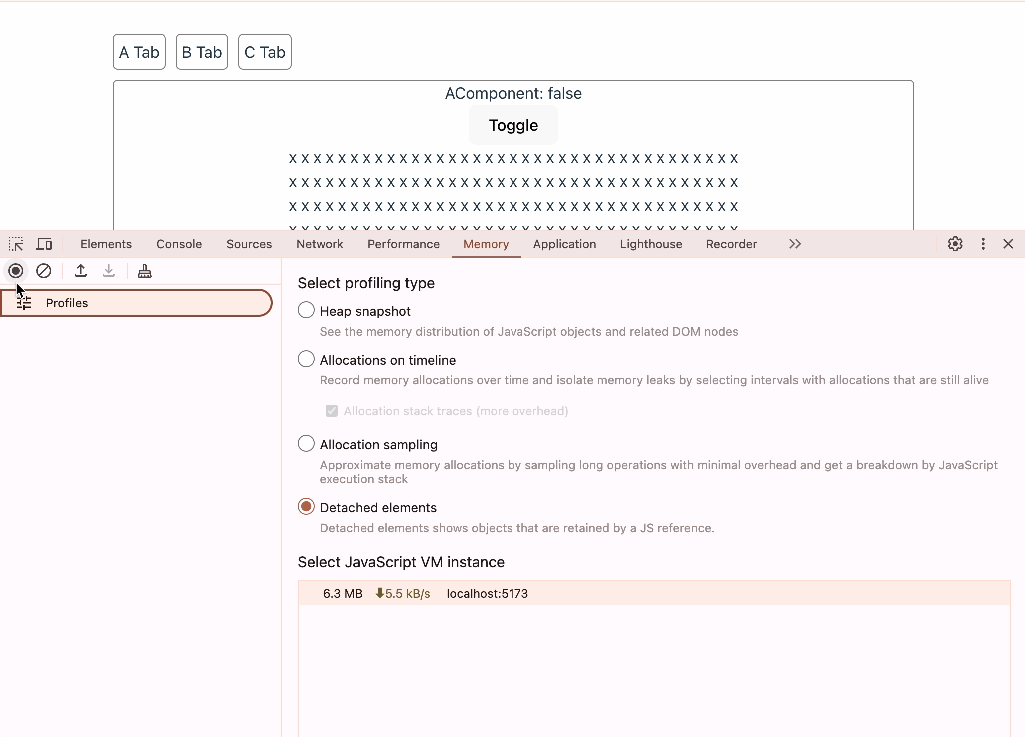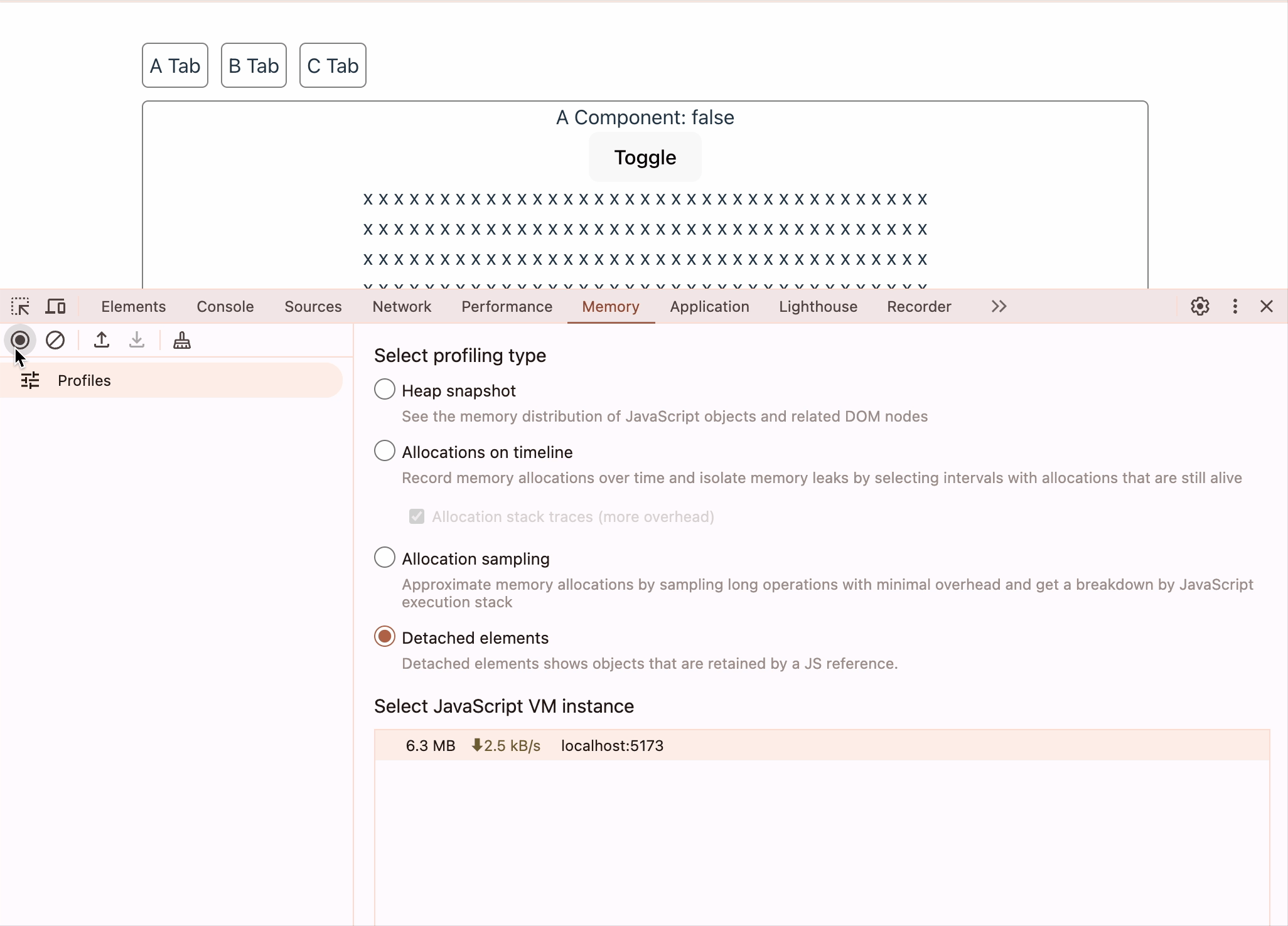 메모리 누수의 원인을 살펴보기 전에 Detached DOM 개념을 알아보자. Detached DOM 객체는 리-렌더링 시 DOM 트리에서 제거된 객체를 의미한다. Detached DOM 객체에 의해 발생하는 메모리 릭(leak)은 DOM 트리에서 제거되었지만, 여전히 JavaScript 코드에서 참조 중인 DOM 객체들에 의해 발생한다. 정리하자면 JavaScript 코드에 의해 참조 중인 Detached DOM 객체들은 가비지 컬렉터에 의해 회수되지 못 하면서 메모리 누수가 발생한다.