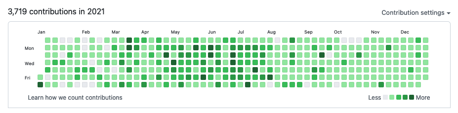 올해 초에 다짐했던 1일 1커밋은 아쉽지만 실패했다. 처음에는 의미 없는 커밋을 만들어내기도 했지만, 그런 행위가 무슨 이득이 있겠냐는 생각에 최대한 자연스럽게 커밋하려고 노력했다. 2022년에는 1일 1커밋을 성공할 수 있도록 부단히 노력해야겠다.