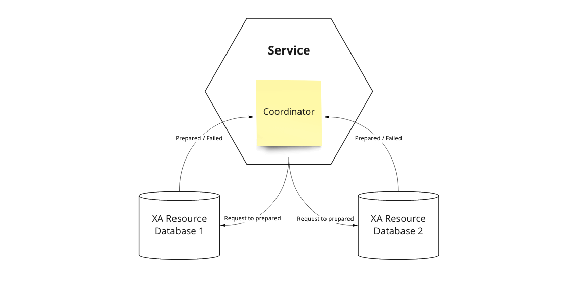 2단계 커밋에는 트랜잭션을 관리하는 별도의 코디네이터(coordinator)가 존재한다. 코디네이터에 의해 2단계에 걸쳐 트랜잭션을 처리한다. 첫 단계(first phase 혹은 prepare phase)는 다음과 같이 동작한다.