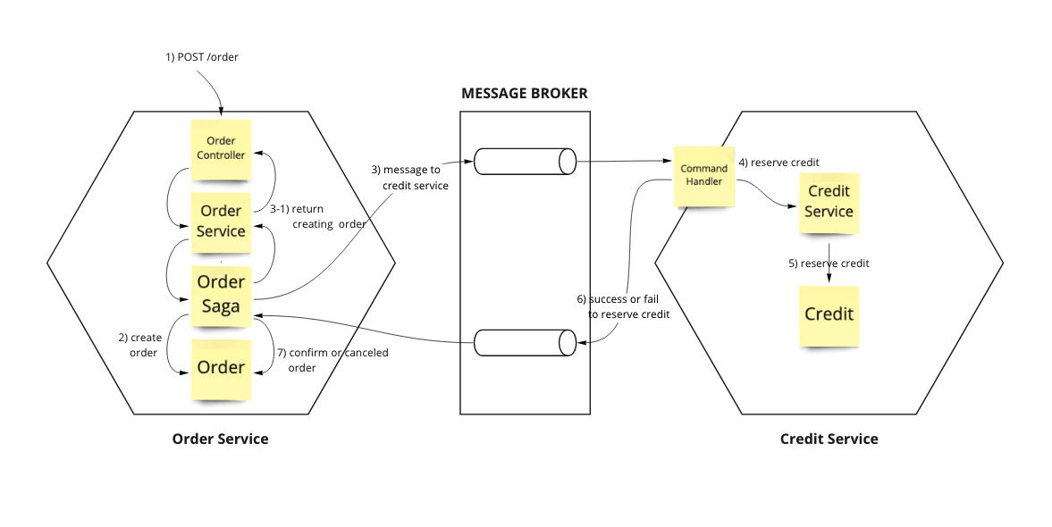 - 주문 사가 컴포넌트는 메시지 브로커를 통해 크레딧 생성 메시지를 전달한다.