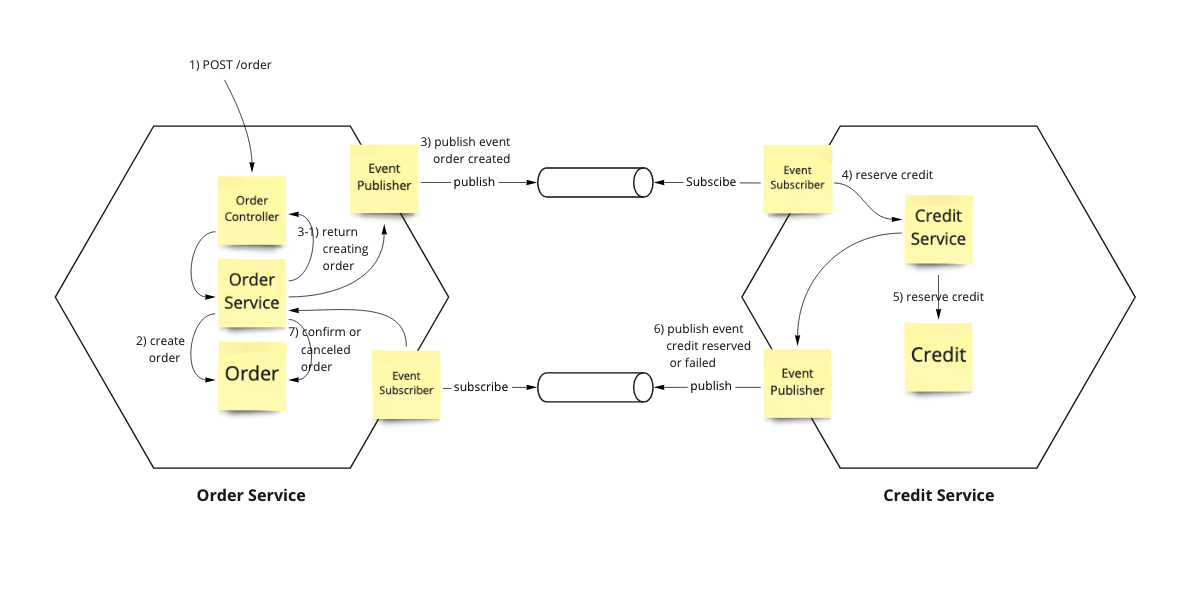 예를 들면 다음과 같은 상황을 생각할 수 있다. 시스템에 주문(order) 서비스와 크레딧(credit) 서비스가 존재한다고 가정하였다.