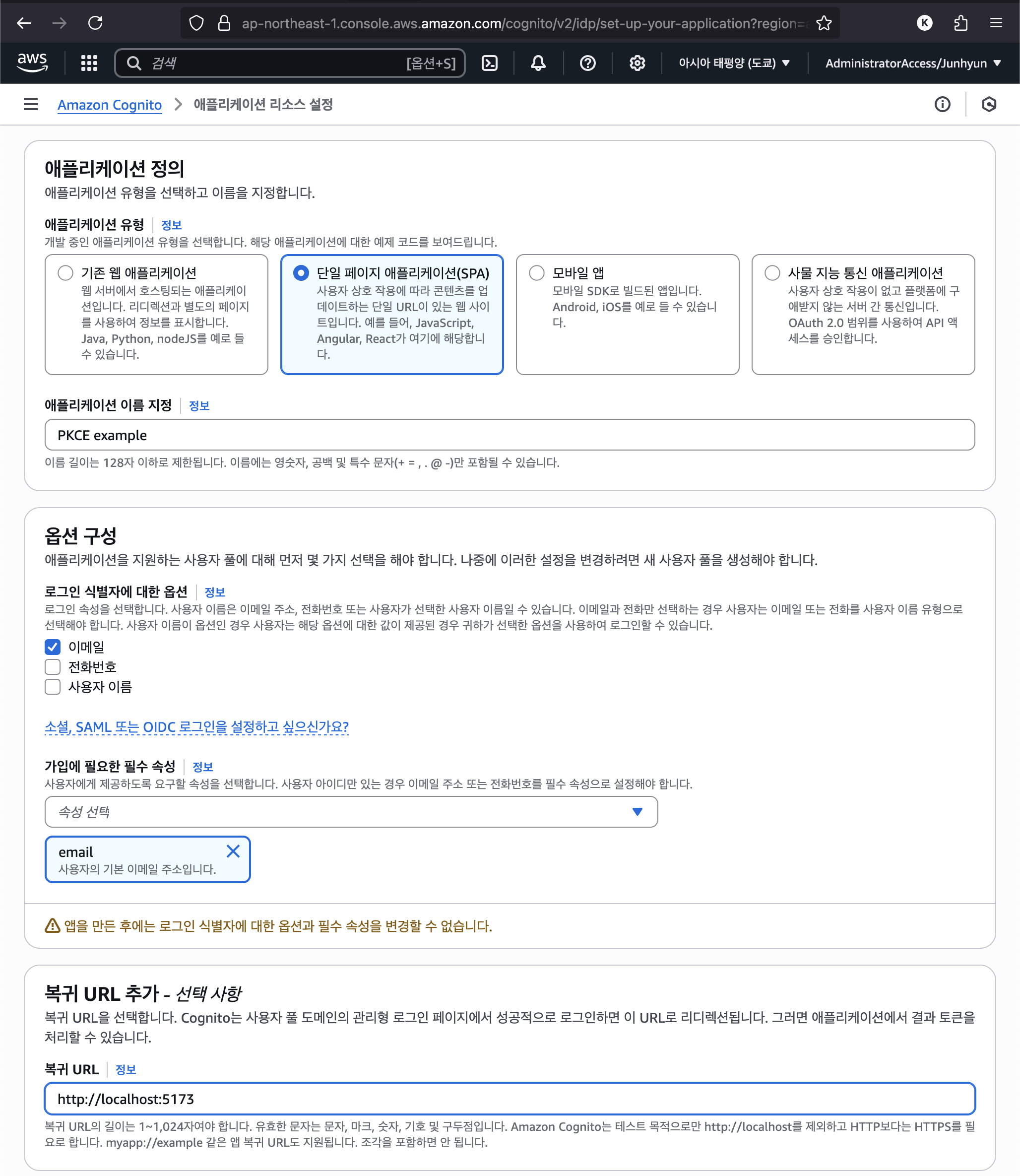 PKCE example으로 지정한다. - 옵션을 구성한다. 식별자와 가입에 필요한 필수 속성으로