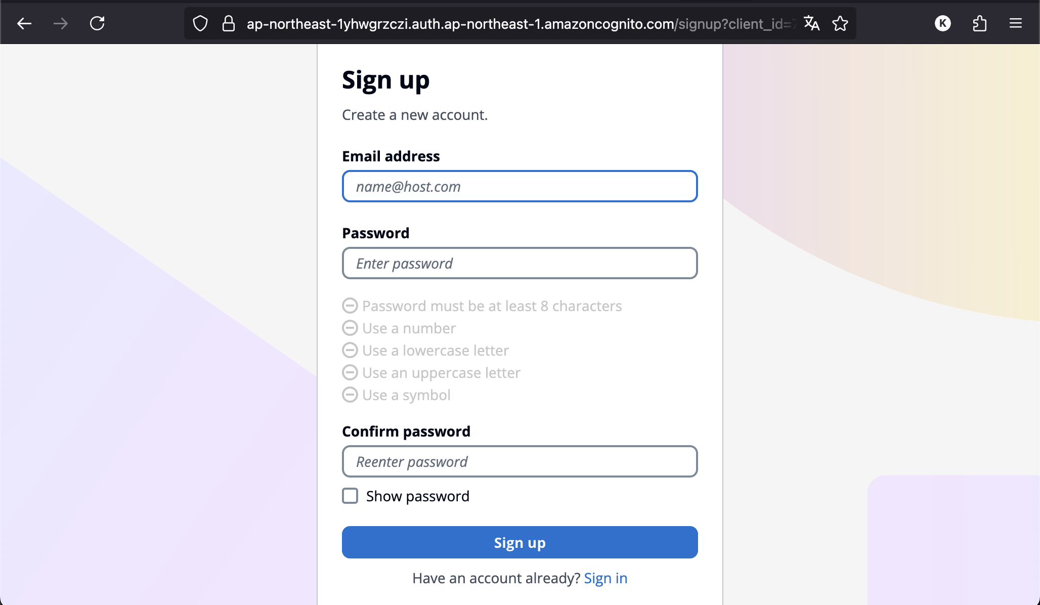Sign in 버튼을 누르면 AWS Cognito가 지원하는 로그인 페이지를 볼 수 있다. 테스트를 위한 사용자를 생성한다.