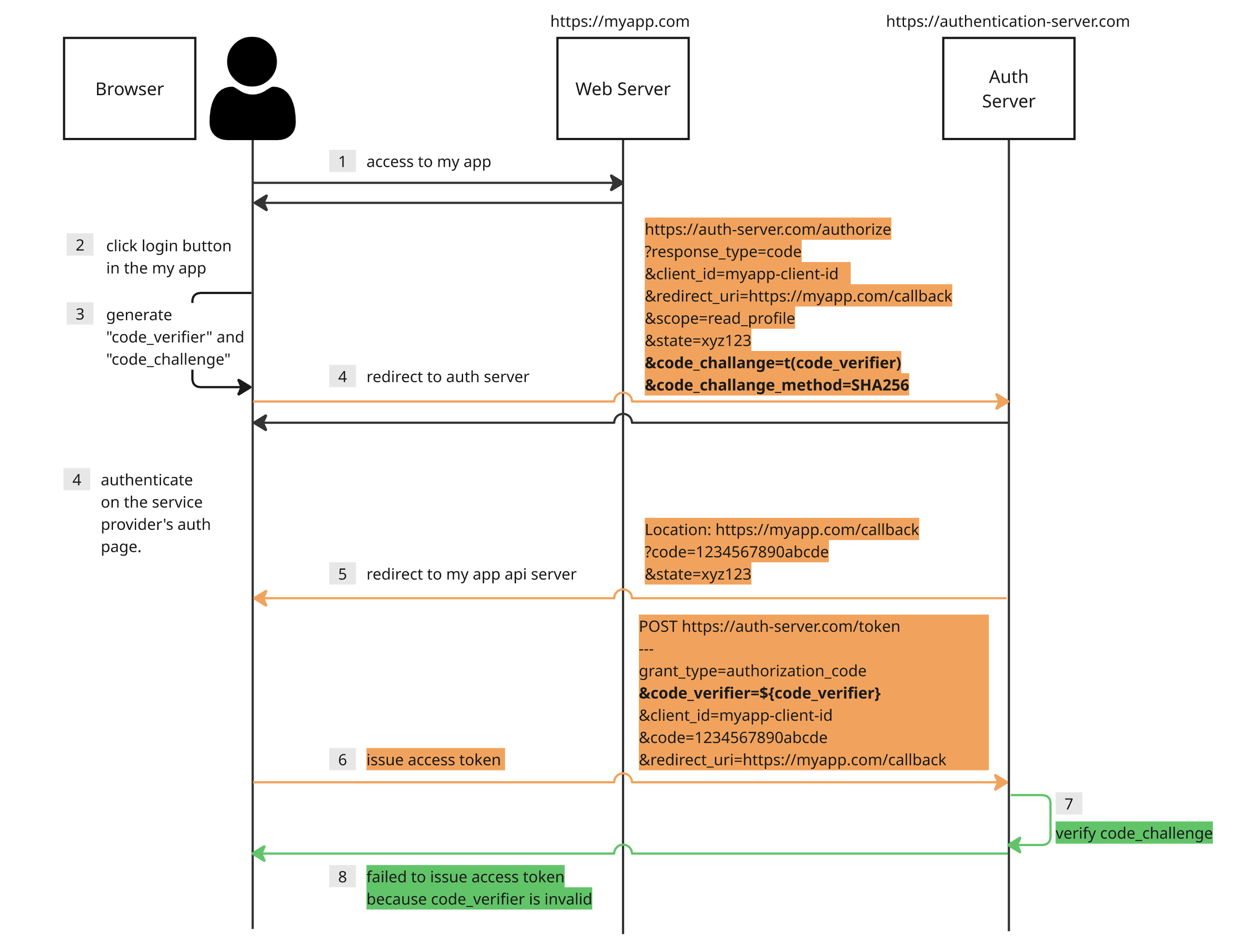 이번 글에선 위 예시 코드와 동일한 동작을 할 수 있는 AuthProvider 컴포넌트와 useAuth 훅을 직접 만들어 볼 에정이다. PKCE 인가 코드 승인 방식은 다음 같은 실행 흐름이 일어난다.