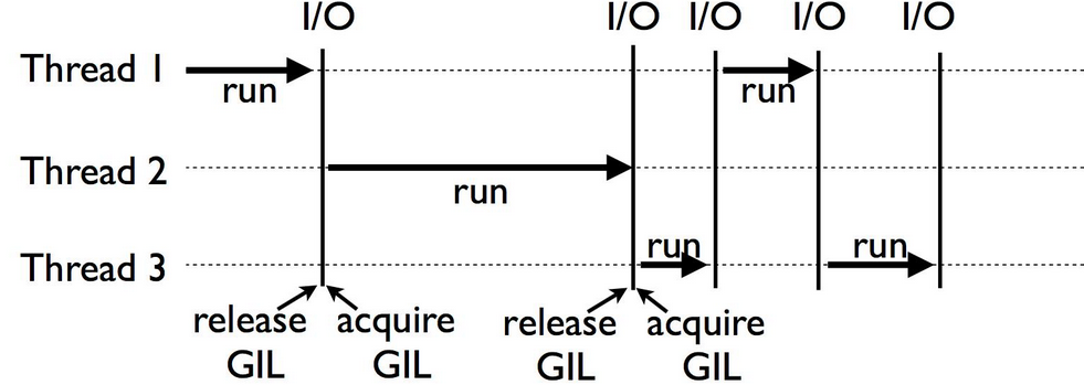 그나마 네트워크 요청이나 파일 입출력(읽기/쓰기)처럼 대기 시간이 긴 I/O 작업이 발생하면 해당 스레드는 자발적으로 GIL을 해제한다. 한 스레드가 I/O 응답을 기다리며 멈춰 있는 동안, 다른 스레드가 즉시 GIL을 획득하여 코드를 실행할 수 있으므로 I/O 대기 시간을 숨기고 병렬적인 처리를 수행하는 효과를 얻게 된다. I/O 작업에 한해서는 멀티 스레드의 이점을 가질 수 있다.