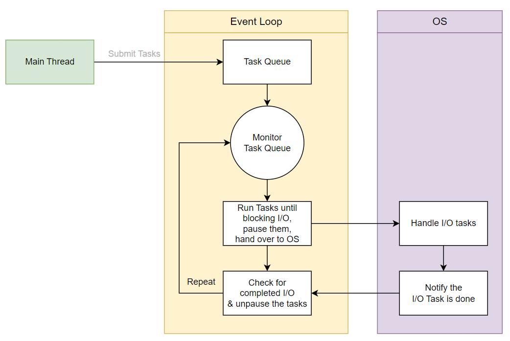 - 실행 중인 코루틴이 I/O 작업을 만나 await 키워드를 호출하면, 실행을 일시 정지하고 제어권을 이벤트 루프에게 자발적으로 양보한다. 비동기 작업은 OS에 의해 처리된다.
