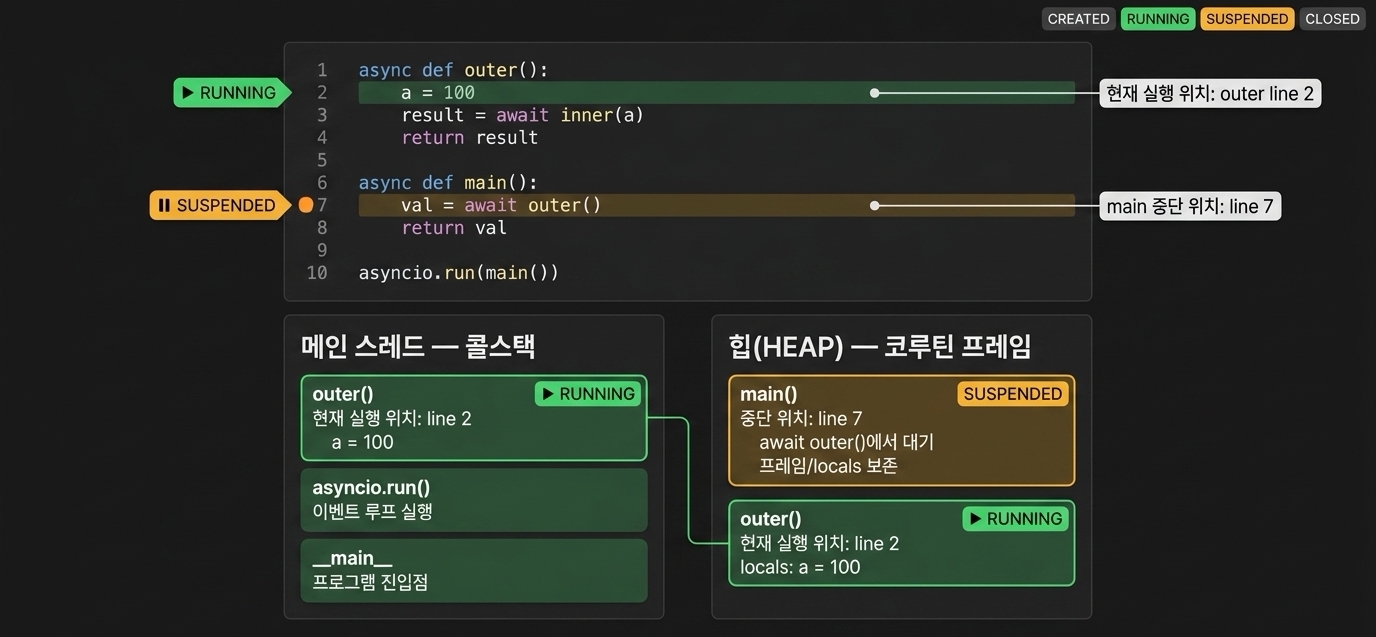 yield 문이 실행되면 코루틴은 자신의 로컬 변수, 내부 평가 스택, 그리고 다음에 실행할 바이트코드의 위치를 기억하는 명령어 포인터 등의 실행 상태를 콜 스택에서 제거하는 대신 힙 메모리의 프레임 객체(PyFrameObject)에 보존한다. 실행 상태가 안전하게 동결(freeze)되면서 코루틴의 실행이 일시 중지되고, yield 문이 발생시킨 값이 호출 체인을 타고 바깥으로 전파되어 최종 호출자인 이벤트 루프로 제어권이 넘어간다.