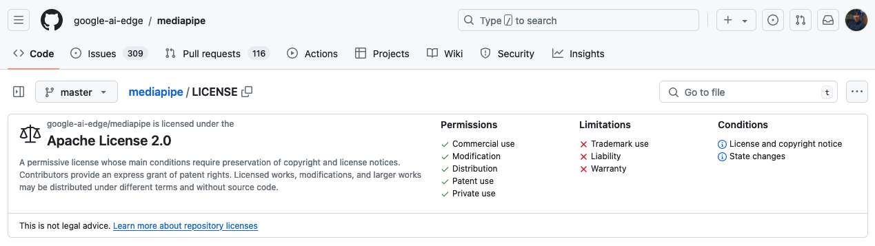 필자는 ChatGPT가 추천한 mediapipe 패키지를 사용했다. 필자는 머신 러닝이나 AI 전문가가 아니기 때문에 mediapipe 패키지가 어떤 모델 혹은 어떤 알고리즘을 사용하는지 자세히 파고 들진 않았다. 먼저 사용 가능한지 라이센스를 살펴봤다.
