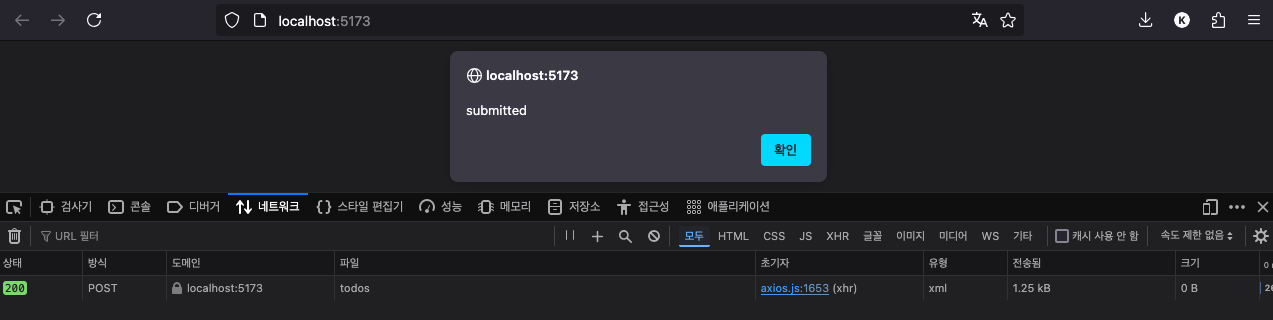 브라우저 화면에서 Todo 아이템을 생성하면 정상적으로 처리되는 것을 확인할 수 있다.