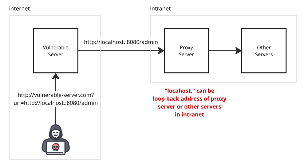 프록시 서버는 내부망에 위치한다. 공격자가 http://localhost.:8080/admin 같은 URL을 요청하면, 외부에서는 절대 접근할 수 없는 프록시 서버 내부의 서비스에 요청이 닿게 된다. 프록시 서버는 해당 요청을 자신의 루프백 주소로 착각해서 내부 정보를 노출할 수 있다. 혹은 인트라넷(intranet)에 위치한 서버로 전달할 수 있다. 연결이 도달한 내부망 서버도 마찬가지로 자신의 루프백 주소로 생각하고 내부 정보를 외부로 노출할 수 있다.