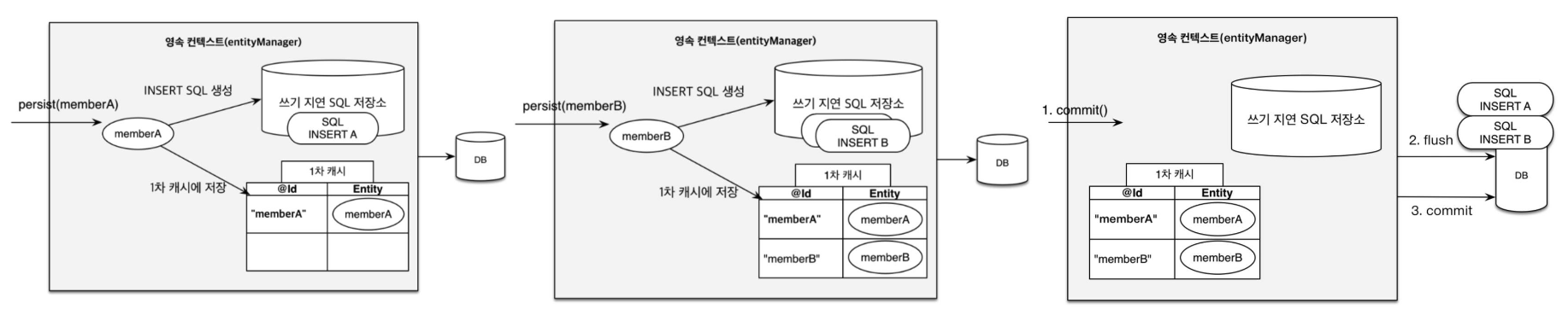 EntityManager는 커밋(commit) 직전까지 insert, update, delete 쿼리를 수행하지 않는다. 내부에 수행할 쿼리들을 모아두고, 커밋 시점에 모아둔 쿼리들을 실행하여 데이터를 저장한다. 쓰기 지연 SQL 저장소는 ActionQueue 클래스 타입의 변수이며, 그림 표현과 다르게 영속성 컨텍스트가 아닌 Hibernate가 제공하는 EntityManager 구현체 클래스에서 직접 관리한다.(org.hibernate.internal.SessionImpl 클래스 참조) 커밋하는 시점까지 쓰기 연산을 지연하면 쓰기 지연은 모아둔 쿼리를 데이터베이스에 한 번에 전달해서 성능을 최적화할 수 있다.