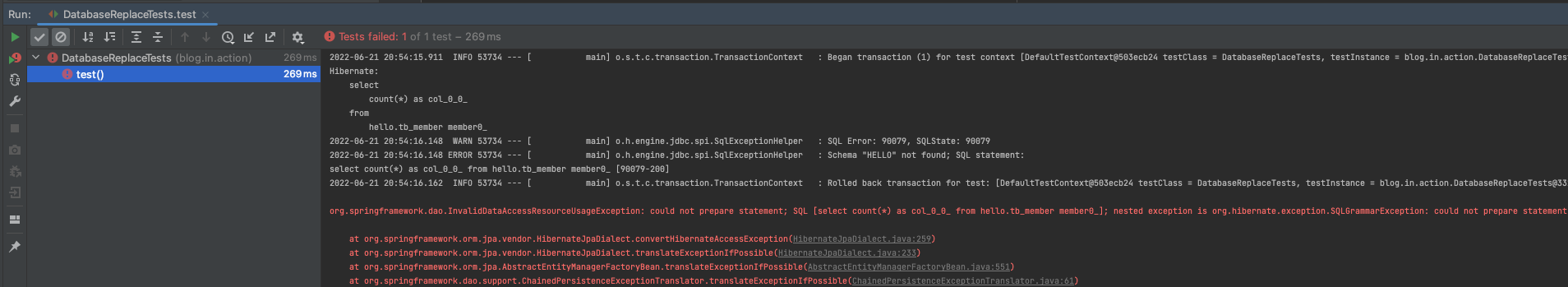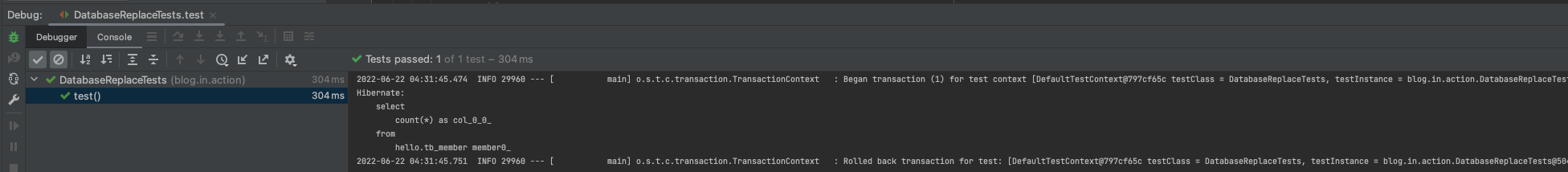 2022-06-21 20:59:34.967 INFO 55902 --- [ main] blog.in.action.DatabaseReplaceTests : Starting DatabaseReplaceTests using Java 11.0.13 on junhyunk-a01.vmware.com with PID 55902 (started by junhyunk in /Users/junhyunk/Desktop/workspace/blog-in-action/2022-06-21-do-not-replace-database-when-using-data-jpa-test-annotation/action-in-blog)