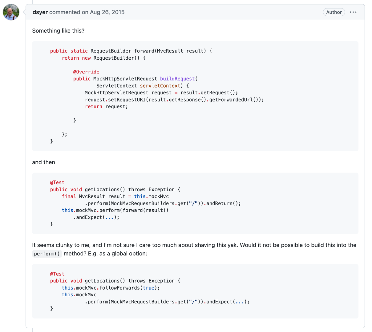 MockMvc를 이용한 포워딩 테스트를 진행하고 싶었지만, 관련된 기능은 제공되지 않은 것 같다. 찾아보니 스프링 진영에서도 관련된 내용에 대한 의견을 나누고는 있는 것 같다.