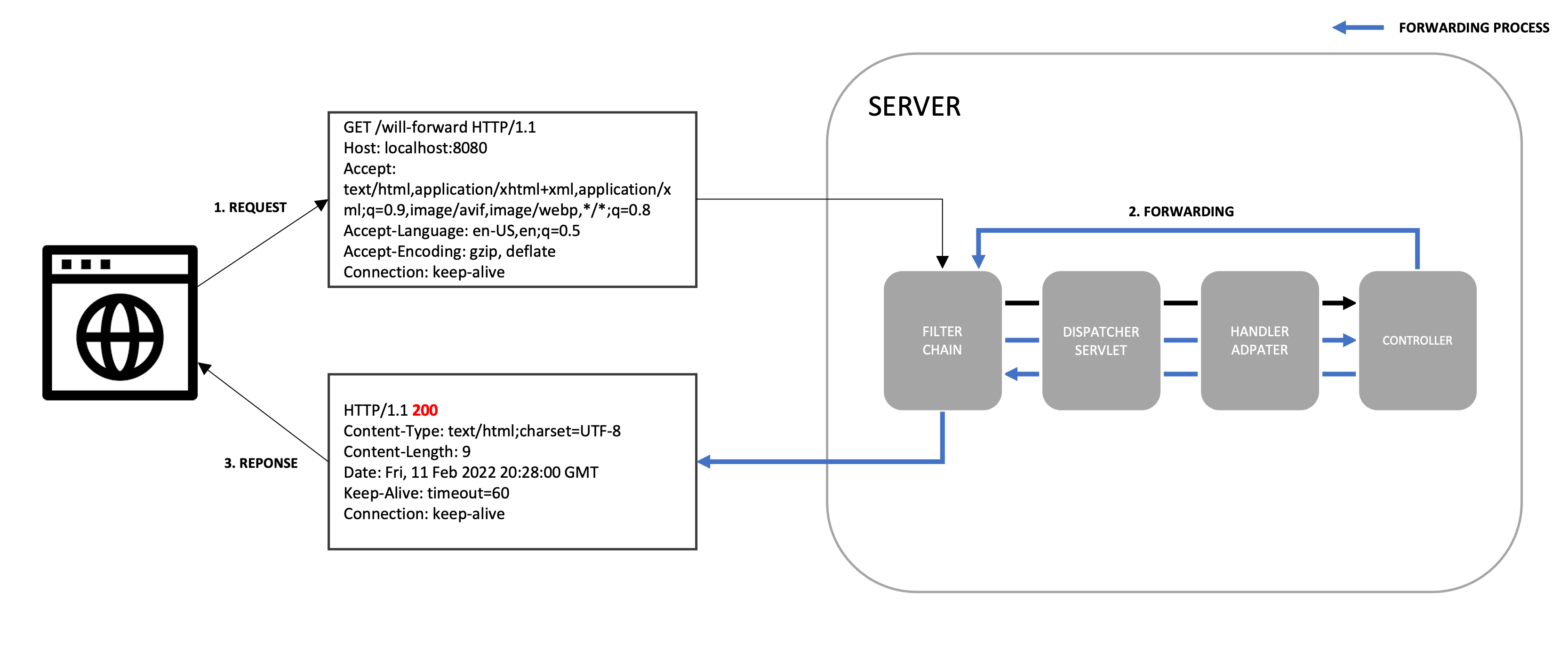 /will-forward 경로로 요청을 보낸 후 각 필터의 로그가 몇 회 수행되는지 살펴보자. 브라우저를 통해 /will-forward 경로에 접근한다.