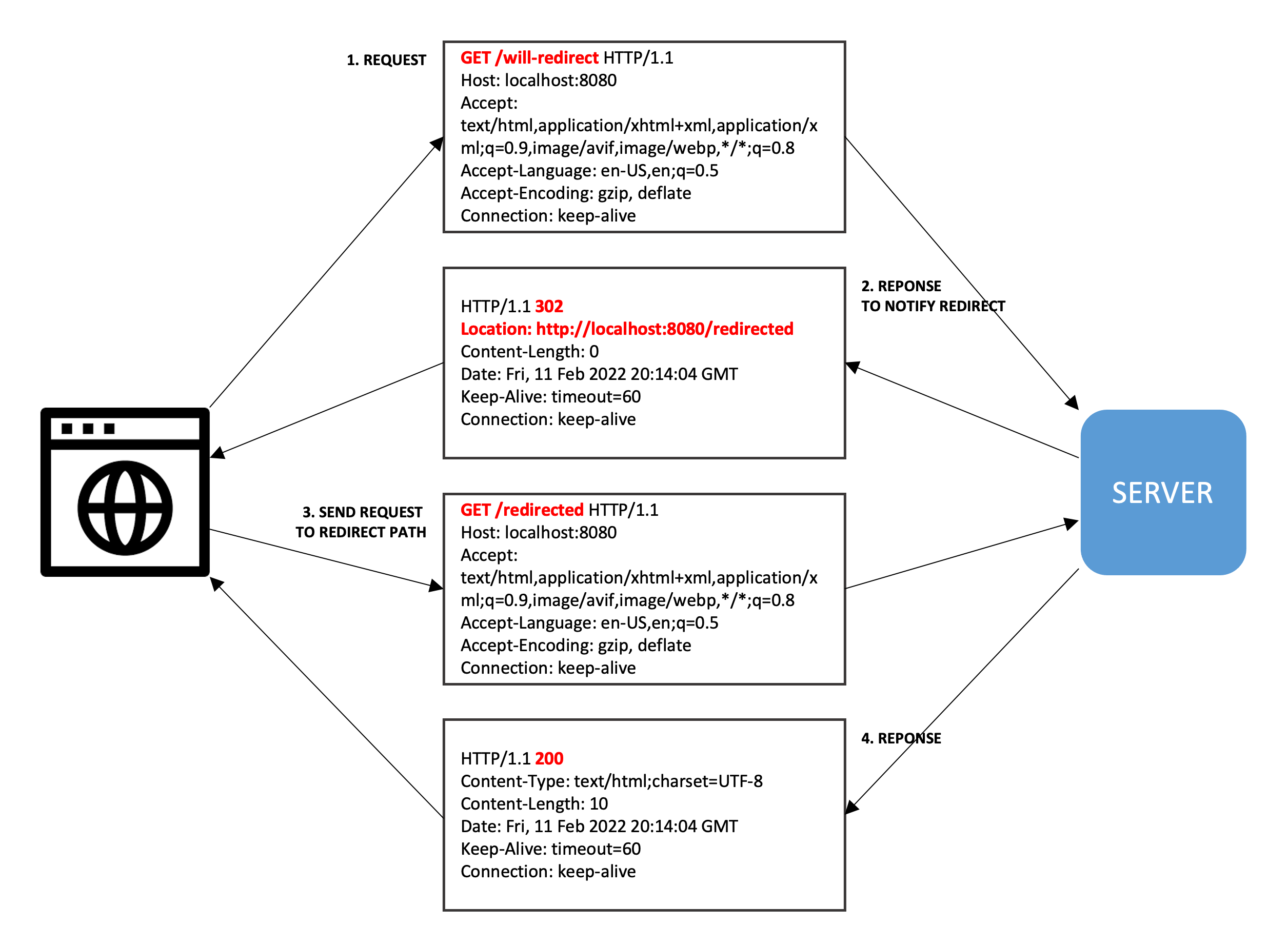 참고한 글 중에 어떤 사람은 리다이렉트(redirect)를 통해 OncePerReqeustFilter 클래스 테스트를 하였는데, 이해가 되지 않는다. 일반적인 리다이렉트는 브라우저가 서버로부터 리다이렉트하라는 302 응답을 받은 후 전달받은 Location으로 재요청을 하는 프로세스이다.
