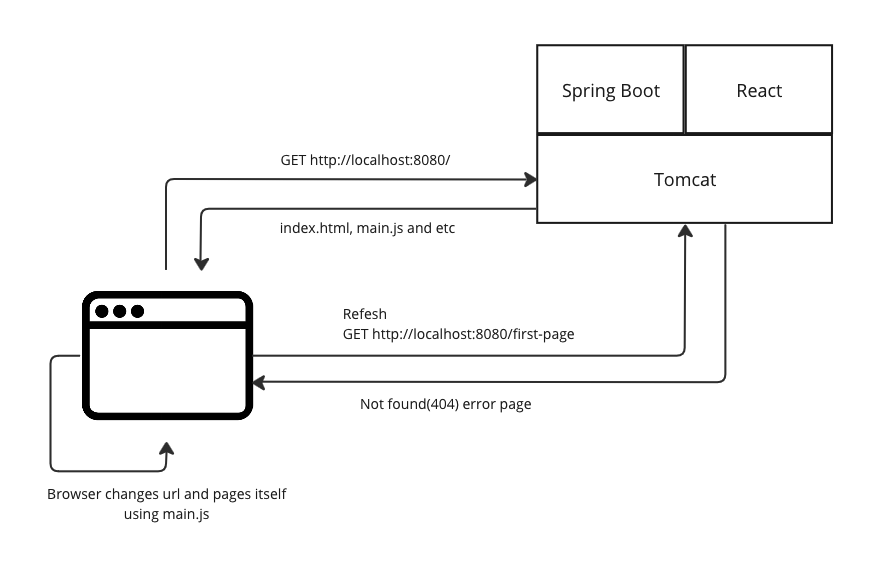 - 브라우저에서 새로고침(refresh)을 수행하면 Not Found(404) 에러가 발생한다.