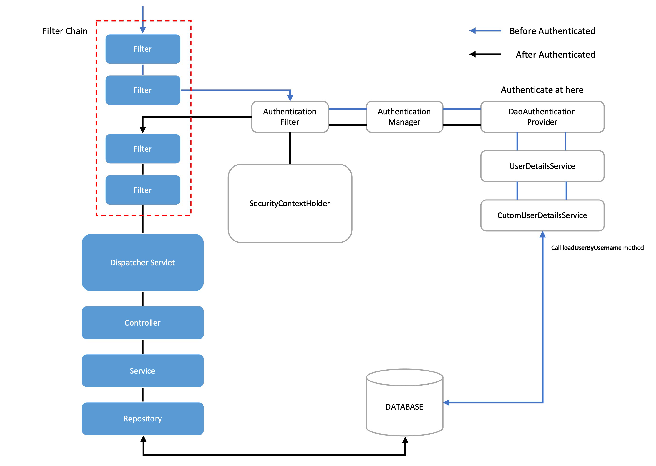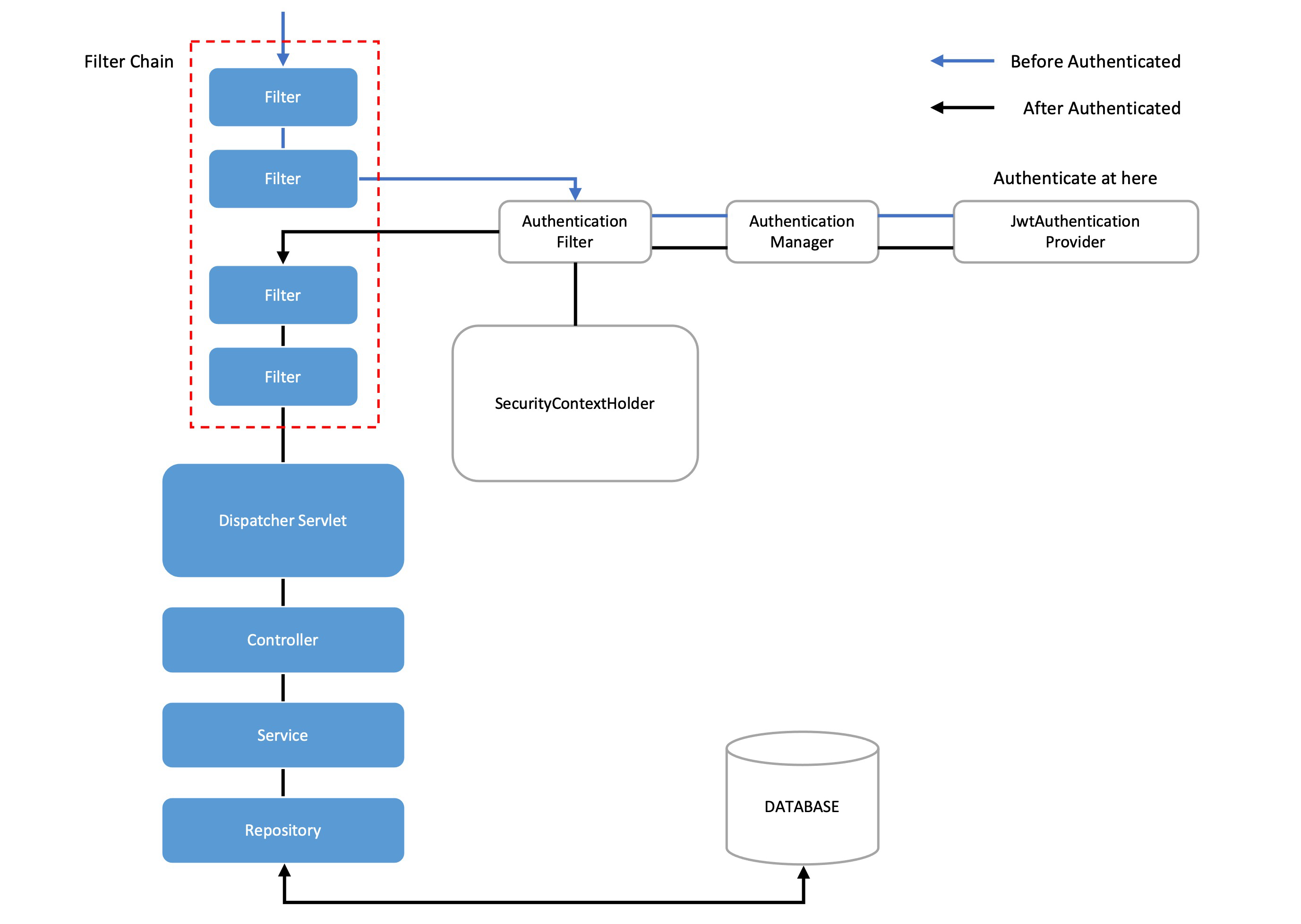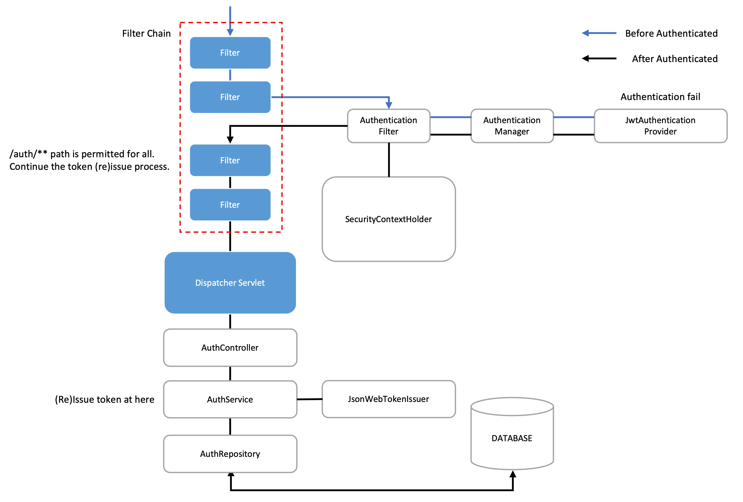 이번 글은 토큰 발행과 재발행과 관련된 로직을 다룬다. 구현 코드를 설명하기에 앞서 스프링 시큐리티(spring security) 프레임워크의 기본적인 인증 프로세스와 의도하고 있는 인증 프로세스를 다시 정리해보자