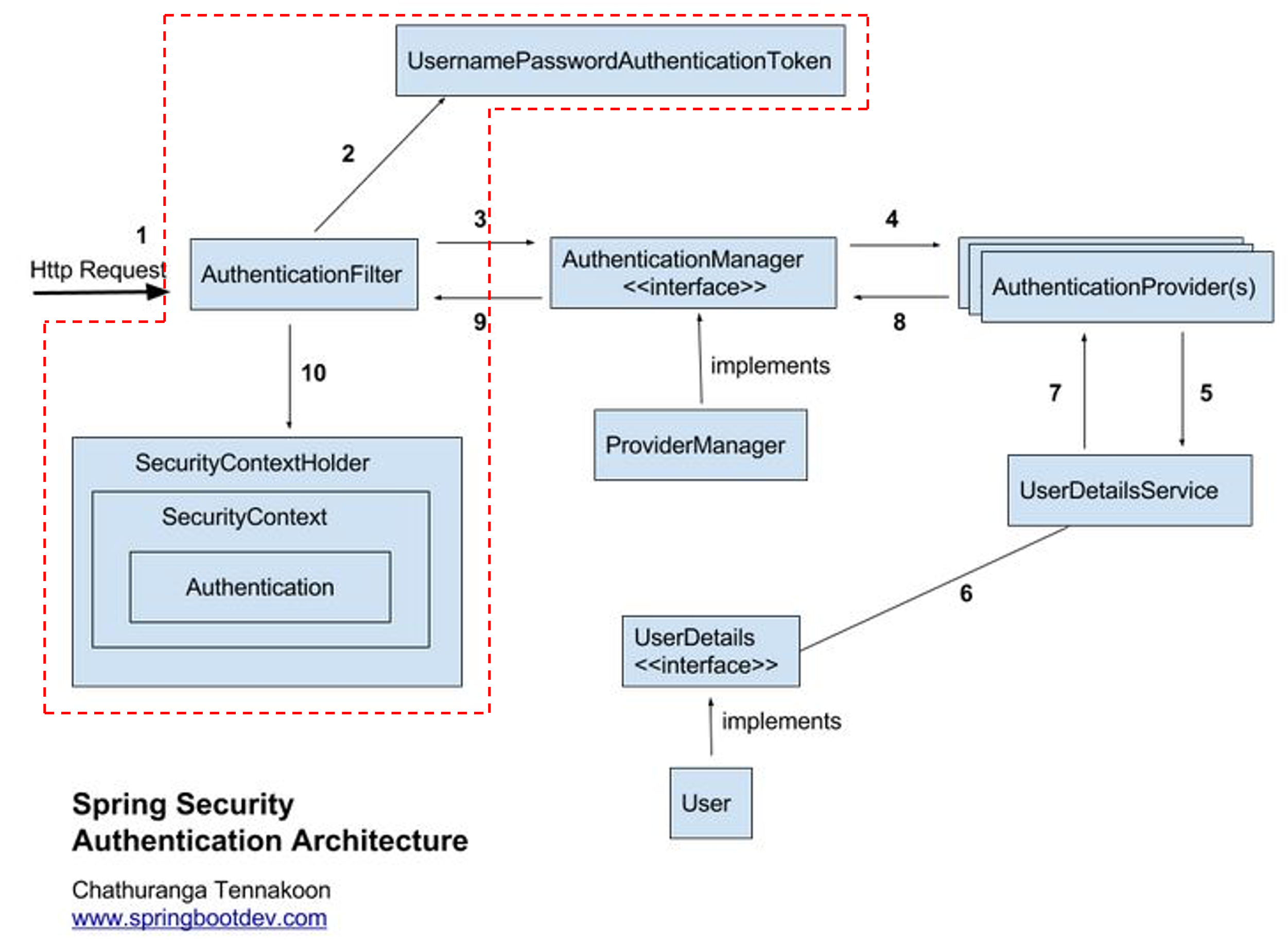 - 아래 그림에 AuthenticationFilter 부분을 JWT(Json Web Token)을 사용한다는 가정하에 구현하였습니다.