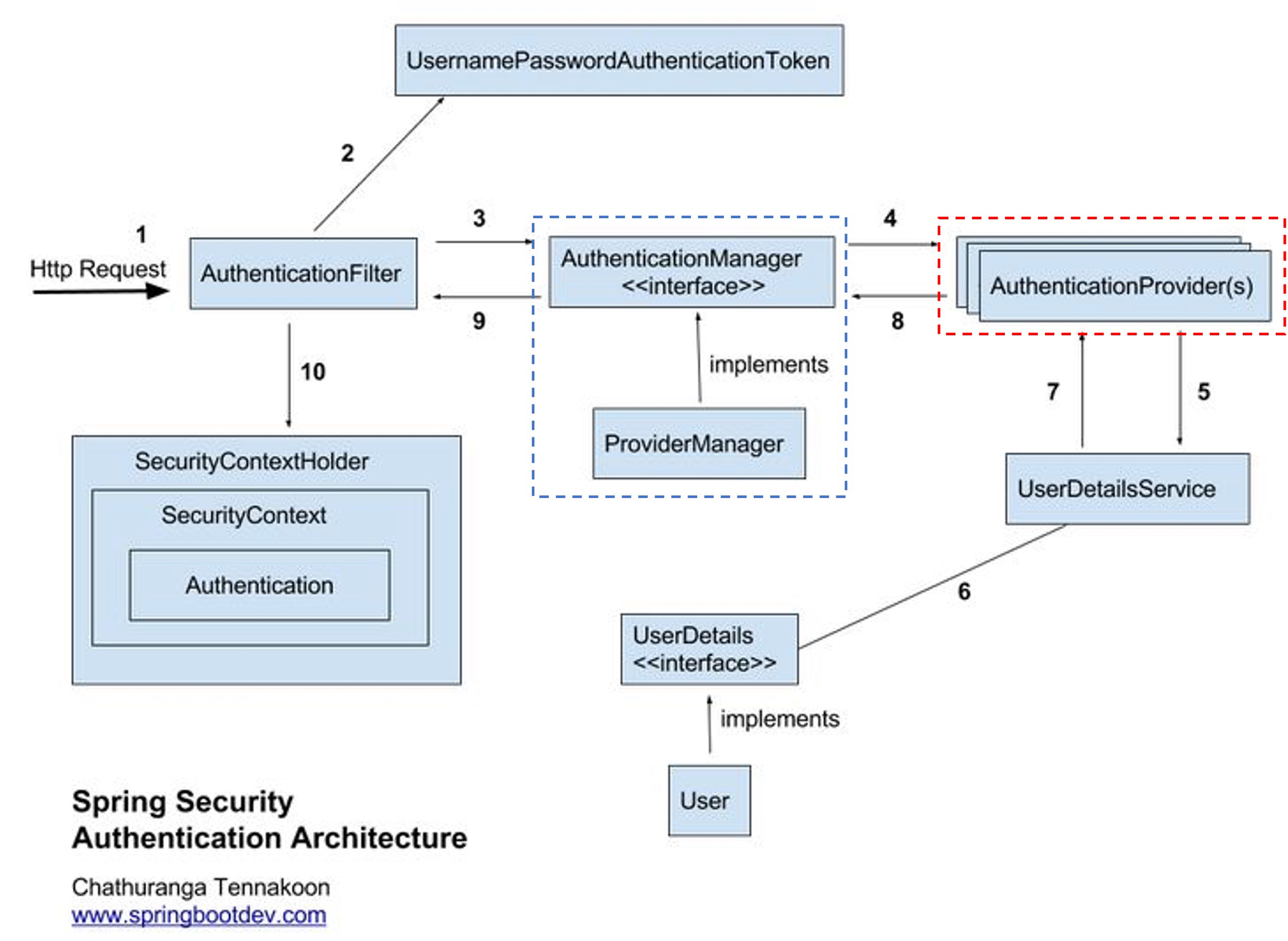Spring Security프레임워크에서 제공하는ProvideManager클래스를 사용하였습니다. - 빨간색 박스 부분이 이번에 구현할