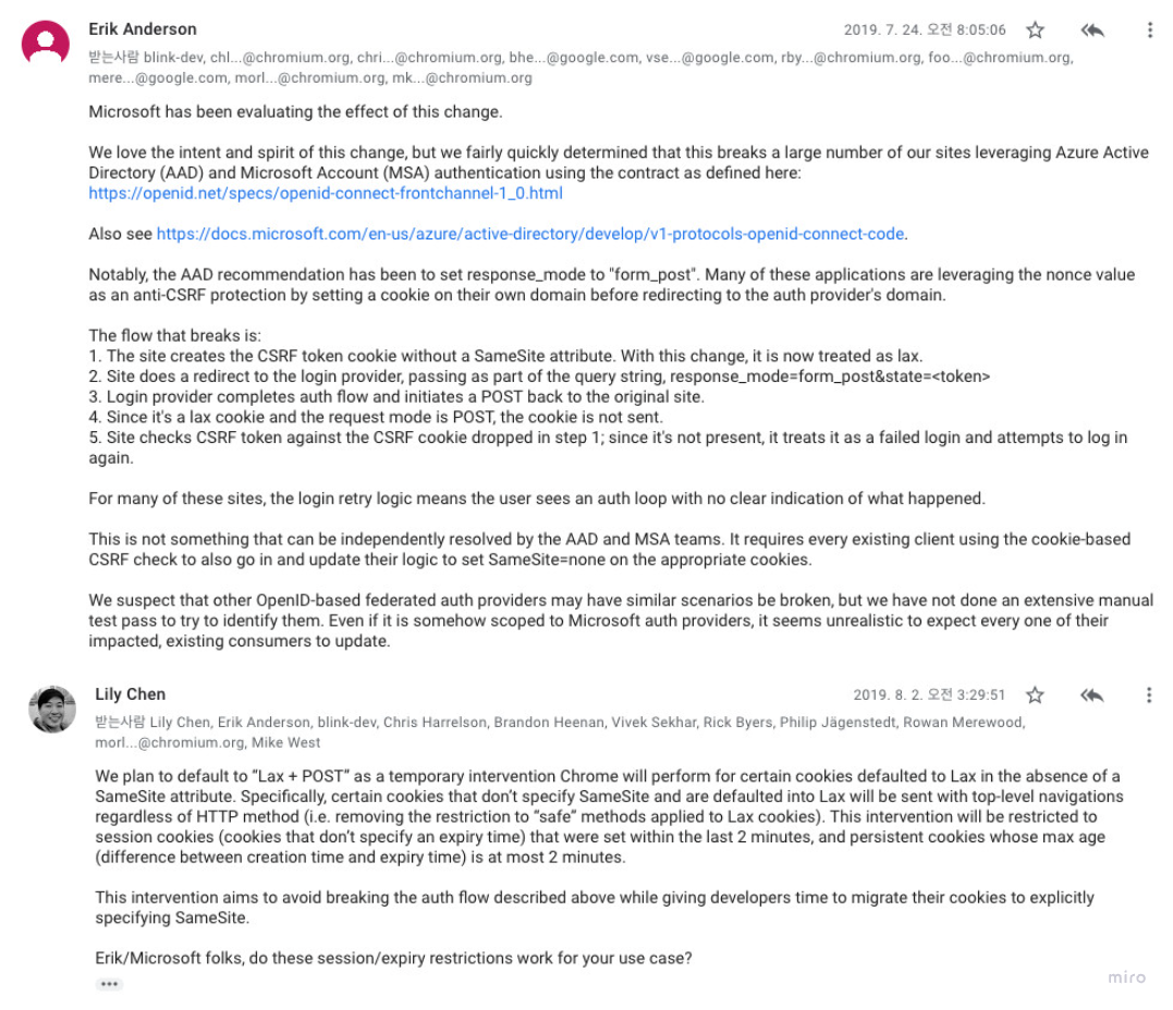 마이크로소프트의 AAD(Azure Active Directory)나 MSA(Microsoft Account Authentication) 같은 OAuth2 인증 메커니즘에도 문제가 있었던 것으로 보인다. 웹 서비스 환경에서 OAuth2 인증 시 브라우저에서 리다이렉트가 발생하는데 SameSite 옵션이 Lax인 경우 쿠키가 중간에 누락되는 문제가 있었다.