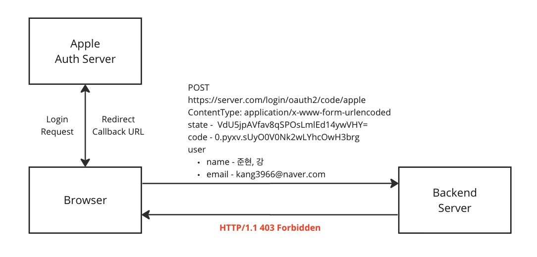 문제 현상을 살펴보자. 웹 환경에서 OAuth2 인증은 리다이렉트(redirect)의 연속이다. 애플 로그인 화면에서 인증 성공 후 애플 인가 서버에서 개발 서버로 브라우저를 다시 리다이렉트 시키는 시점에 문제가 발생한다. 문제가 발생하는 두번째 리다이렉트 시점에 다음과 같은 정보들이 서버 콜백 URL로 전달되고 403 에러 응답을 받는다.