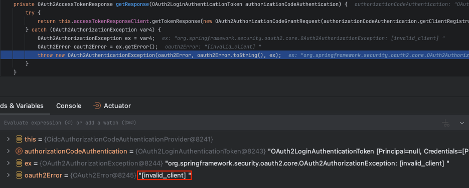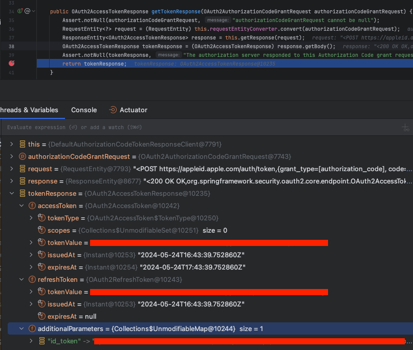 로컬 호스트에서 디버깅을 해보면 인증 제공자(AuthenticationProvider) 인스턴스가 애플 인가 서버에서 액세스 토큰(혹은 아이디 토큰)를 받을 때 다음과 같은 에러가 발생하고 있었다.