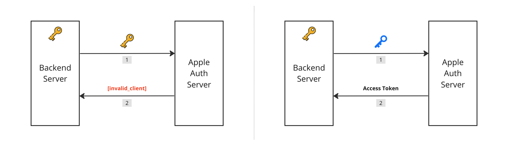 무엇이 문제일까? 공식 문서와 깃허브 이슈들을 살펴 보고 힌트를 얻을 수 있었다. 리다이렉트 요청을 받아 처리할 때 애플 인가 서버로 액세스 토큰(혹은 아이디 토큰)를 발급 받는다. 이 때 애플 개발자 센터에서 사전에 발급 받은 클라이언트 시크릿을 사용하면 에러가 발생한다. 새로운 클라이언트 시크릿(client secret)을 만들어야 한다.