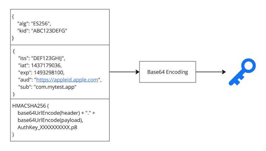 마지막으로 JWT 토큰 서명(signature)을 만들 때 AuthKey_XXXXXXXXXX.p8 포맷의 비공개 키 파일을 사용한다. 애플 개발자 센터에서 해당 파일을 발급 받는다. 헤더, 페이로드, 서명까지 모두 Base64 인코딩하면 새로운 클라이언트 시크릿이 만들어진다.
