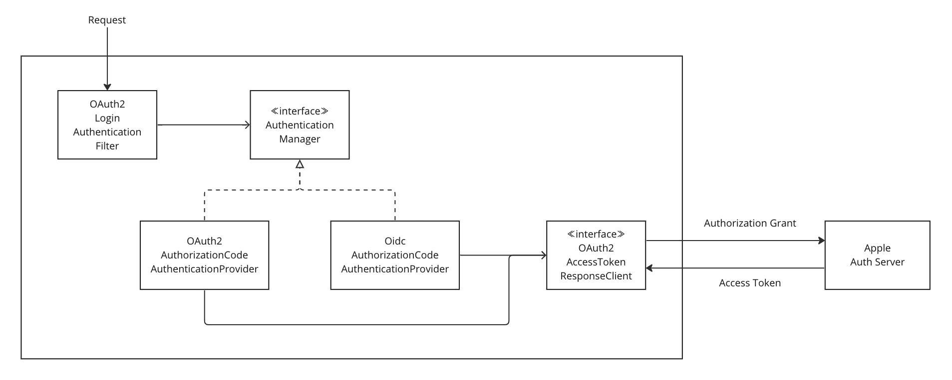 기존 기능에 영향을 주지 않으면서, 새로운 기능을 확장할 수 있는 지점을 찾아야 했다. 아무리 테스트 코드가 있더라도 영향도 파악이 되지 않기 때문에 기존 코드를 고치는 것은 최대한 피하고 싶었다. OAuth2 인증 프로세스에 참여하는 컴포넌트들을 훑어보다 기능을 확장하기 가장 적합한 컴포넌트를 발견했다.