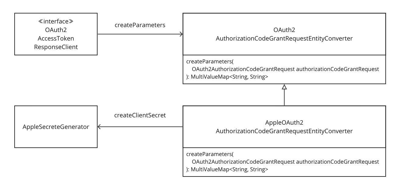여기서 OAuth2AccessTokenResponseClient 인스턴스가 의존하는 OAuth2AuthorizationCodeGrantRequestEntityConverter 클래스를 확장했다. 클라이언트 인스턴스는 해당 컨버터(converter) 객체에게 권한 부여 요청에 필요한 파라미터 생성을 요구한다. 필자는 이 파라미터 생성하는 createParameters 메서드를 확장했다.