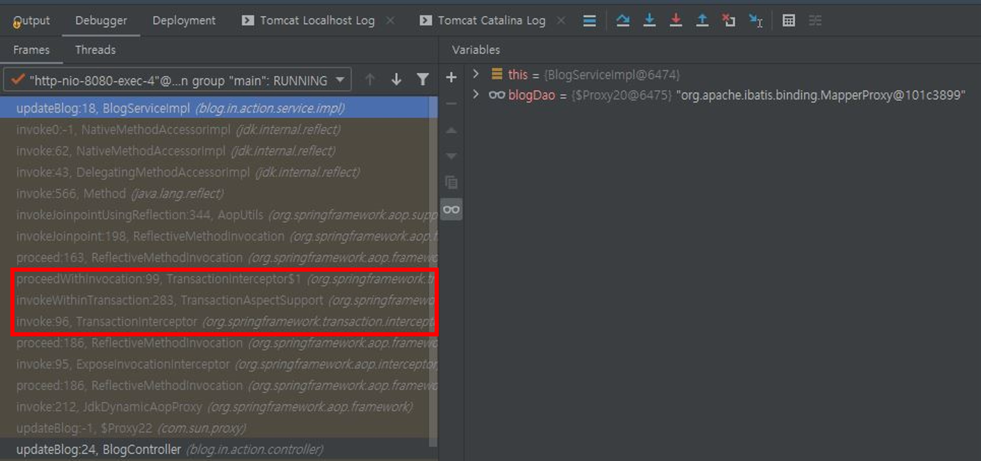 - 스택을 보면 트랜잭션 처리를 위한 인터셉터가 존재한다.