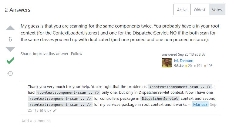 트랜잭션 처리가 실패하는 현상이 프록시 객체가 아닌 일반 객체를 주입 받아서 발생한다는 것은 확인했다. 어떤 이유로 이런 현상이 일어나는지 문제의 원인을 찾아보았다. 언제나 그렇듯 스택 오버플로우(stack overflow)에서 해답을 찾을 수 있었다.