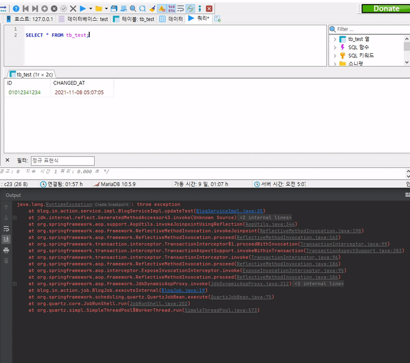 CHANGED_AT항목이 5초마다 갱신되는지 확인합니다. - 예외(exception)가 발생한 경우에는