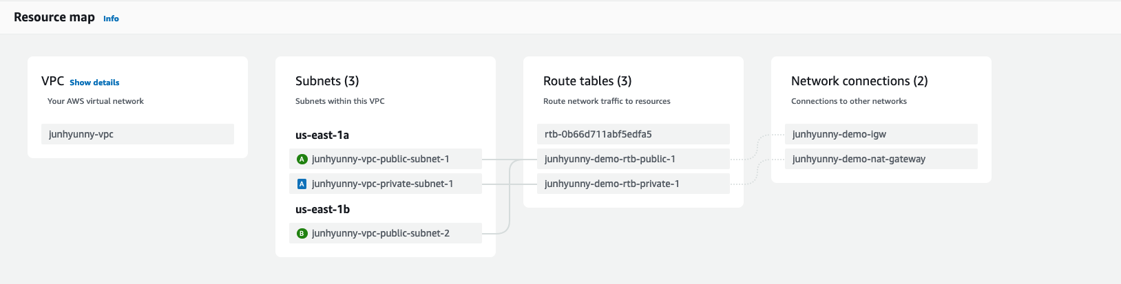 테라폼 작업이 완료되면 웹 콘솔 VPC 리소스 맵에서 다음과 같은 VPC, 서브넷, 게이트웨이 그리고 라우트 테이블을 확인할 수 있다.